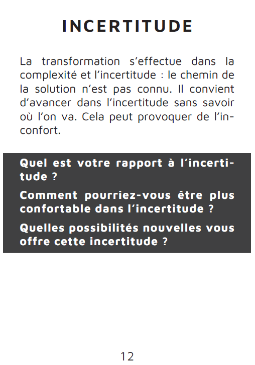 Pour chacune des cartes, un texte explicatif est suivi de questions qui invitent l’accompagnant, ou l’animateur de la démarche de transformation, à prendre du recul, décaler son regard sur une situation à laquelle il peut se référer dans son quotidien.